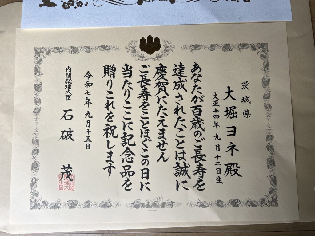100歳のお祝い 投稿日 2025-10-26 著者 久保木 カテゴリー ブログ 先日、デイサービスに通っていらっしゃる利用者様が100歳のお祝いで市にお祝いをしていただきました! まだまだ元気で明るく場を和ませて下るので、元気にこれからもいてほしいですね。 100歳のお祝い